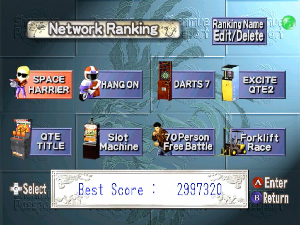 Get ready to face off against the best darts players in the world because Shenmue Passport is now back online thanks to the efforts of Xiden and Jial! A special thanks also goes out to flyinghead and Shuouma who also contributed their big brains to the project. I should note that the Shenmue Passport has been partially functional for a few years now but the most important part, the online rankings, didn’t work until today. Yes indeed, you can now face off against other players around the world by uploading your high scores for Space Harrier, Hang-On, Darts, Excite QTE 2, QTE Title, the slot machine, 70 Person Free Battle, and the forklift race!