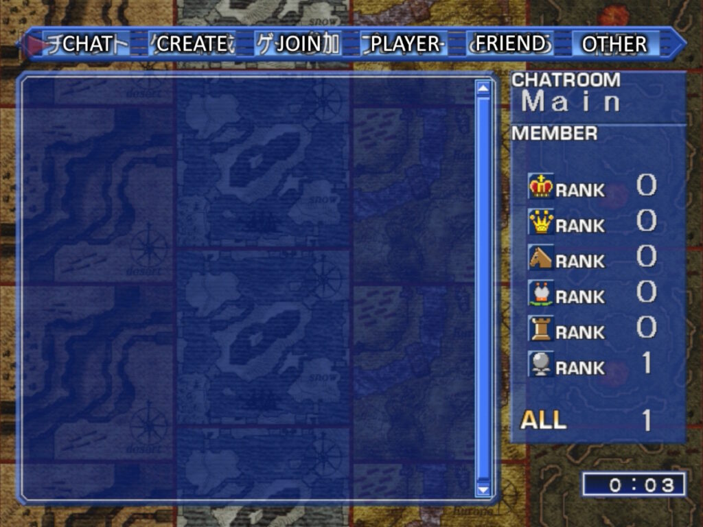 A patched version of the game is required to play online which is available from the Downloads page. The patched game is available in the original Japanese or a version with English translated online menus. The main menu options are still in Japanese but the online play option is the second option to the left when you first start up the game.